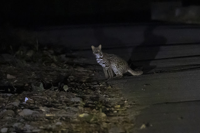 I tried my luck at Nam Chung one evening for owls but failed miserably as expected...I was however rewarded with a rather confiding Leopard Cat! I saw its eye-shine from afar and first thought it was a domesticated cat, but upon looking through my binoculars I was shocked to see a beautifully marked creature sitting in the middle of the road! It later came closer and sat quietly towards the side, where I had brilliant views for at least 10 minutes! It later ran across the road and disappeared up the slope.