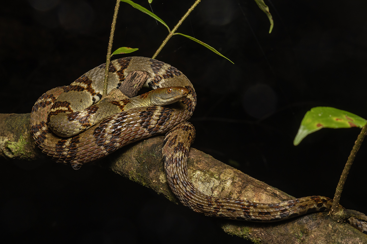 We went back and forth a few times along the same stretch of river, but coming up empty handed once again. I suggested we try something else just to keep ourself from going insane, so we walked into a little footpath that run along a smaller stream, while there were not a single bird in sight, a snake suddenly crashed landed right in front of us! Which turned out to be a Beauty Rat Snake! After that rather lousy entrance it swam away swiftly.